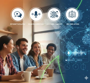 The course builds speaking confidence through interactive audio lessons with native speakers, using voice recognition to perfect your pronunciation.